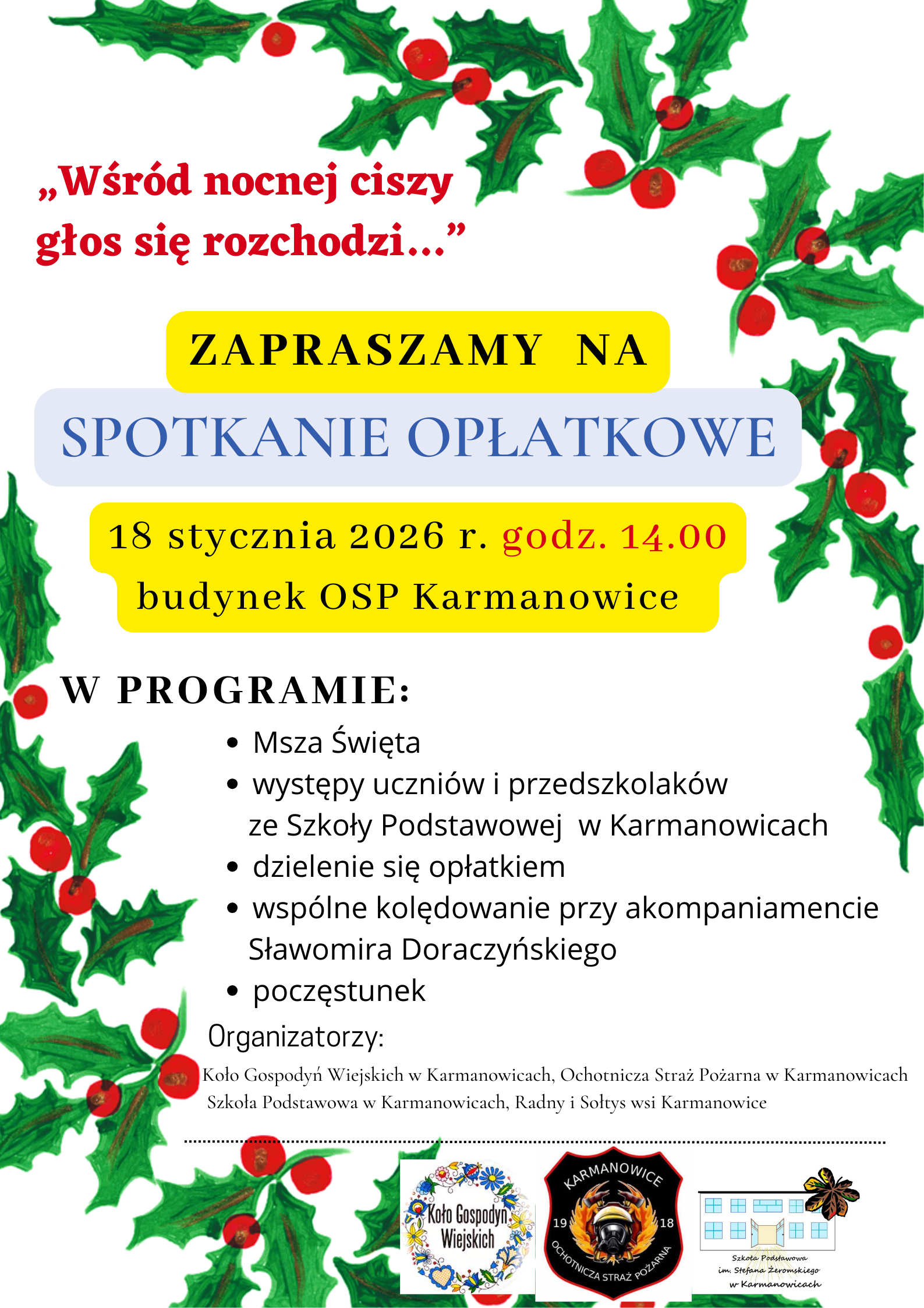 Koło Gospodyń Wiejskich w Karmanowicach, Ochotnicza Straż Pożarna  w Karmanowicach, Szkoła Podstawowa im. Stefana Żeromskiego w Karmanowicach, Sołtys i Rada Sołecka oraz Radny wsi Karmanowice serdecznie zapraszają wszystkich mieszkańców Karmanowic i okolic na Spotkanie Opłatkowe, które odbędzie się 18 stycznia 2026 r. o godz. 14.00 w budynku remizy OSP Karmanowice.